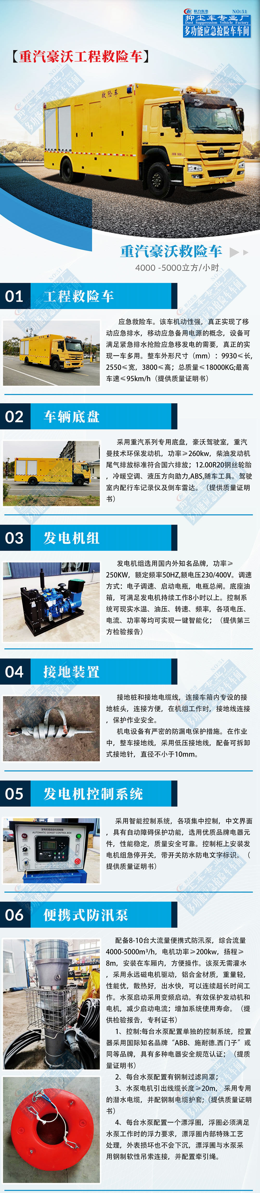 工程抢险车配备多台便携式潜水泵,泵体装有提手,方便搬运。水泵泵体采用高强度轻质铝合金材质制作,叶轮采用耐磨、耐腐蚀优质不锈钢制作,一体成型,潜水深度20米;水泵配有不锈钢丝滤网,有效阻止垃圾堵塞,损坏水泵;每台水泵上安装20米潜水电缆,电缆与**柜之间采用防护等级IP67的快速插头连接,操作简单,使用安全。单泵配置聚胺脂高强度浮圈,一体成型,满足水泵工作时的浮力要求,具卡口吊环连接软性吊索;水泵可以使用发电机组或市电正常工作。