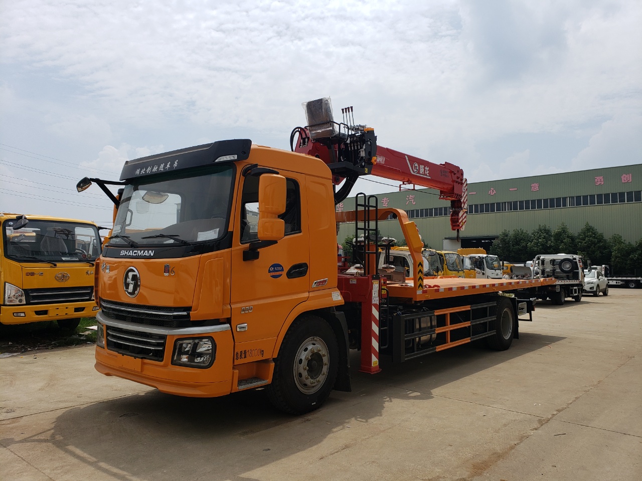 上装配置:板长6.8米,宽2.55米,平板10吨上装,5mm花纹板,边框50*150(可选配实心钢板),滑道10个厚,加厚双副架,后托可做主梁承载10吨三节臂,10吨液压卷扬,双侧联动装置,意德利海德多路阀,叉具一套,其余标配。